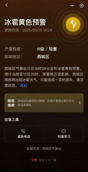北京的北京气象天文台将在今天(9月13日)遇到从西部到此的散布风暴。短期内,当地的降雨强劲,在7-9级的短期内伴随着强风,在山区地区有一个小的ail。